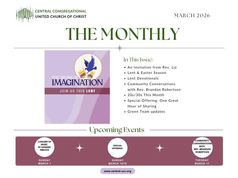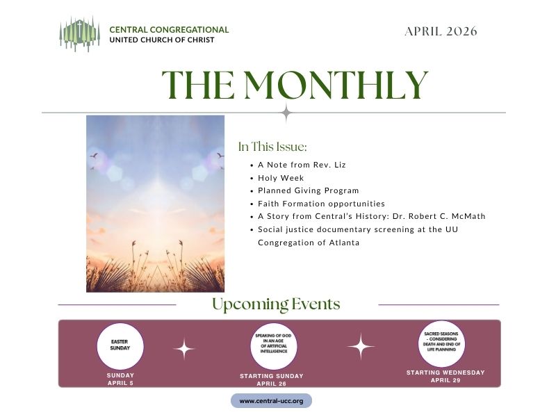 Central Congregational UCC is an open & affirming, justice and peace-seeking, progressive congregation in Atlanta, GA. We’d love the opportunity to meet you on your faith journey!