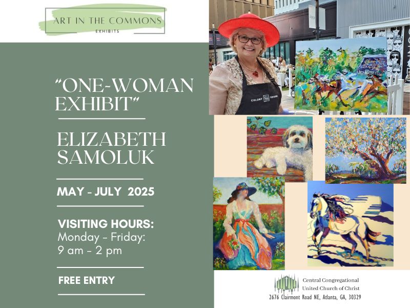 Featured ONE-WOMAN EXHIBIT artist this spring and summer 2025 is Elizabeth Samoluk. Her artworks include oil, acrylic, watercolor, and drawing, with most works created “En Plein Air” throughout Atlanta, from the Atlanta Botanical Gardens, Sandy Springs, Roswell, and Savannah, Georgia. Elizabeth also included some pieces from her western journeys to capture the beauty of our U.S. National Parks and UNESCO World Heritage Sites! Elizabeth is happy to donate a portion of her sales to the church.