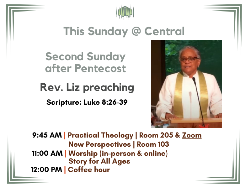 When Summer Church: A Season of Exploration began, some of us wanted to explore what music and worship mean to Central, what part they play in our faith development and congregational life, and what possible creative possibilities could enrich our worship life together. As you may recall, we asked people to share favorite music and to say a bit about how it comes to be meaningful. Each contribution has a wonderful story, I have no doubt, and I would love to hear them all. These stories can teach us things about ourselves and our faith—yes, our own story—that may not be visible to us until we are asked and probe for significance.